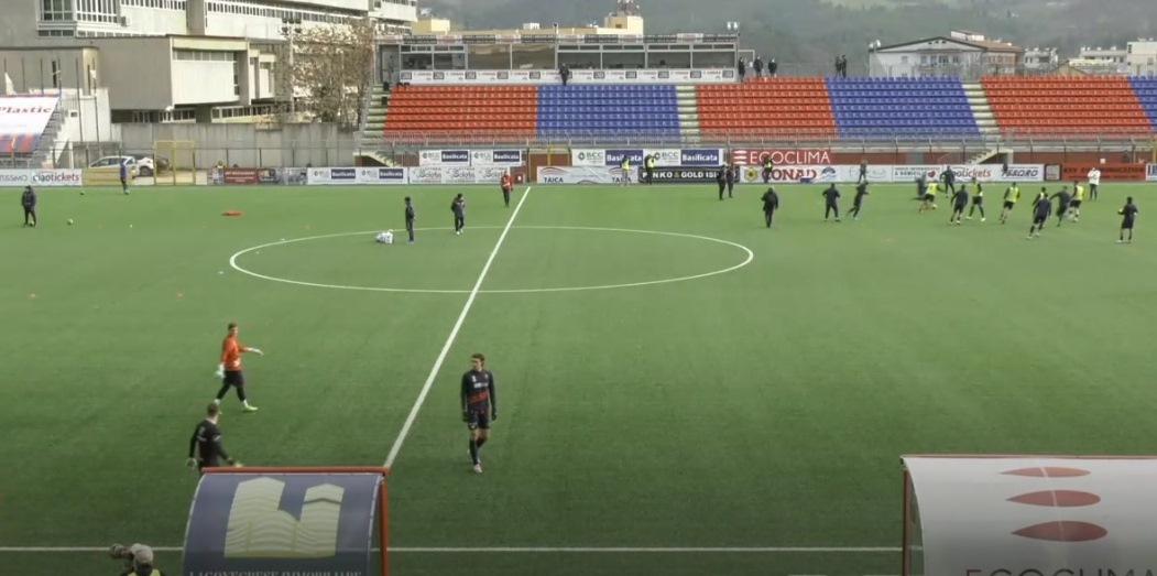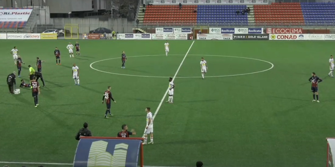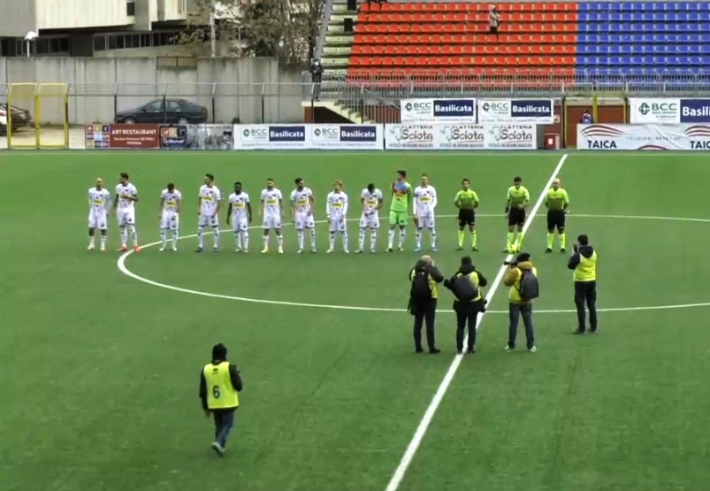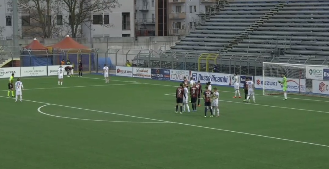 Al 22′ Piovanello effettua il tiro da fuori area trovando però la presa a terra del portiere dei padroni di casa. Al 31‘ arriva la prima occasione per il Potenza con Compagnon che tenta il diagonale e per poco non inquadra la porta. Due minuti dopo è Calapai a provarci dopo un velo di Sarao, ma il suo tiro termina alto sopra la traversa. Nei minuti finali del primo tempo i ritmi si alzano e al 38′ un sinistro di Cianci termina fuori. Due minuti più tardi Confente blocca un colpo di testa di Coccia. L’arbitro non dà recupero e il primo tempo tra le due squadre termina a reti bianche.
