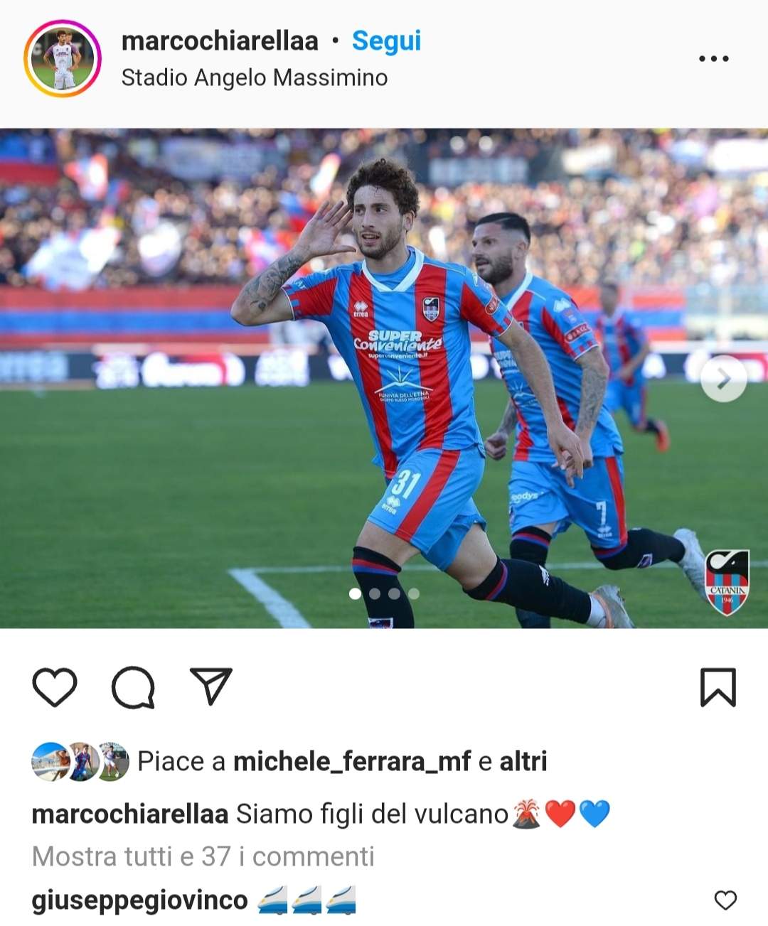 Marco Chiarella, autore del momentaneo 2-0 contro il Ragusa, evidenzia lo spiccato senso d’appartenenza del Catania sottolineando: “Siamo figli del vulcano”. Amici e tifosi incoraggiano Alessandro Russotto a non smettere d’inseguire i propri sogni. Andrea Russotto, invece, ascoltando la canzone ‘Emozioni’ di Lucio Battisti pubblica una foto che lo ritrae esultante dopo il gol.