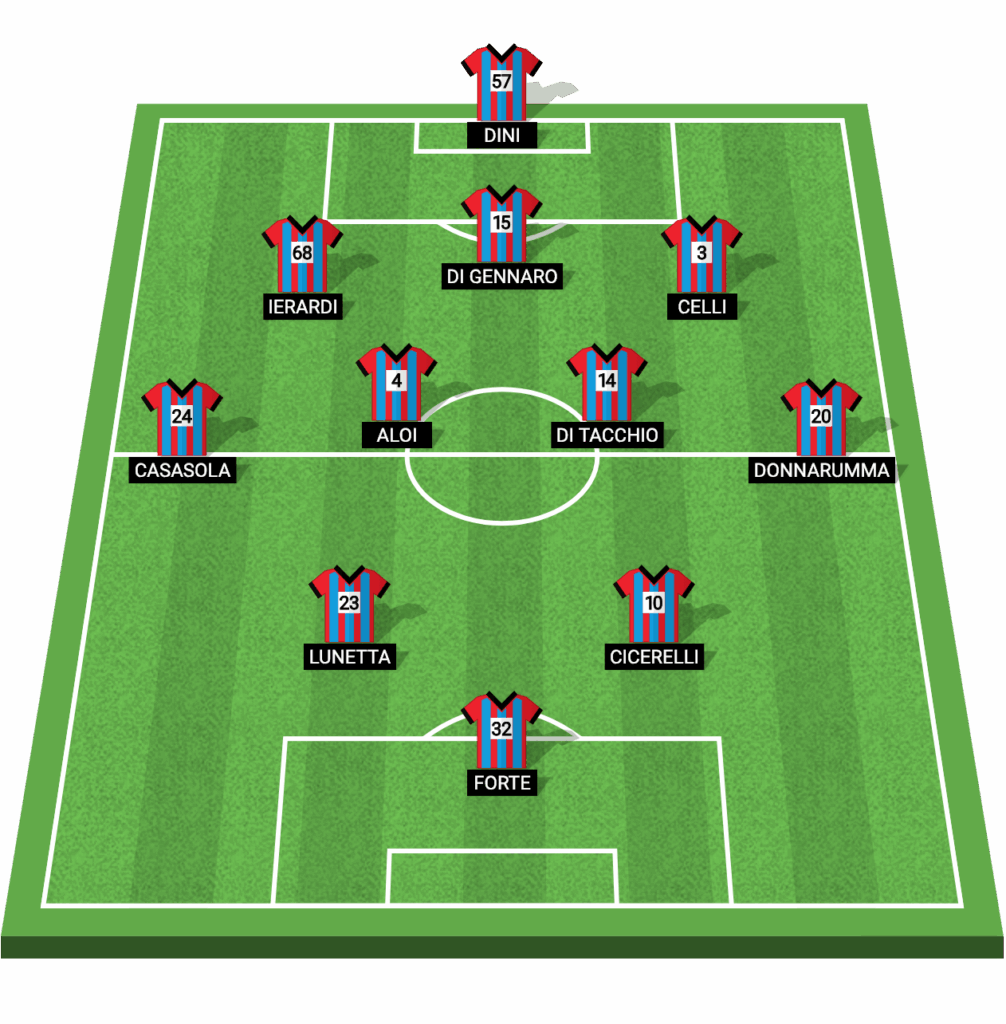 In occasione del match dello stadio “Angelo Massimino” contro il Benevento, mister Domenico Toscano farebbe bene a schierare il seguente undici rossazzurro secondo la maggioranza dei votanti al nostro consueto sondaggio pre partita: Dini a difesa dei pali; Ierardi, Di Gennaro, Celli a completamento del reparto arretrato; Casasola, Aloi, Di Tacchio e Donnarumma a centrocampo con Lunetta e Cicerelli alle spalle di Forte. Rispetto alla precedente gara disputata in trasferta al cospetto della Salernitana, i tifosi sarebbero dunque favorevoli ad inserire Aloi dal 1′.